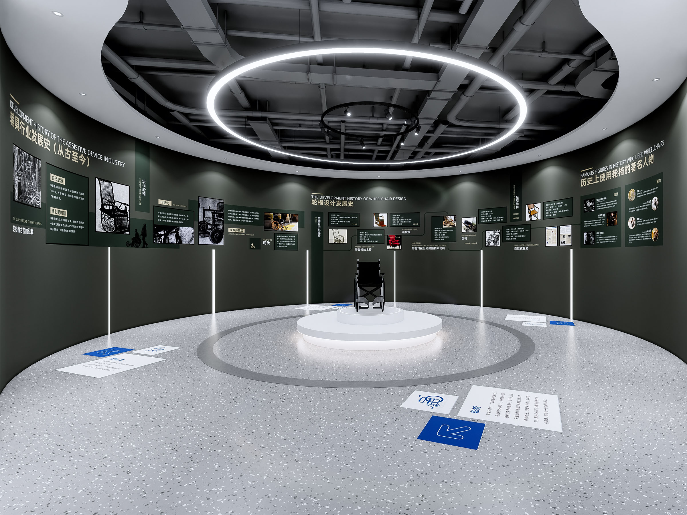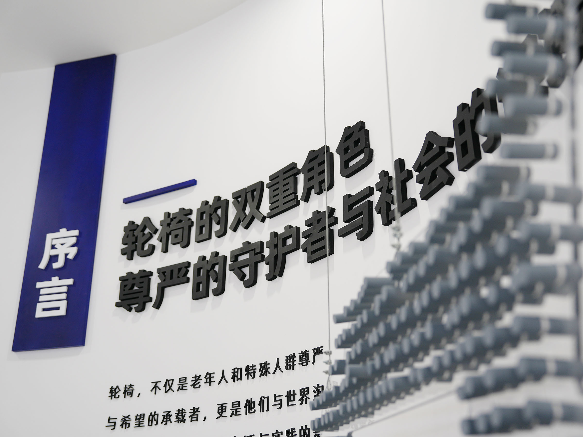 會(huì)議的第一站是互邦一樓展廳。展廳的主題是空間與權(quán)力,展廳占地面積約400平方米,進(jìn)入展廳首先映入眼簾的是序言:“輪椅,不僅是老年人和特殊人群尊嚴(yán)與希望的承載者,更是他們與世界溝通的橋梁。”這段文字深刻揭示了輪椅的社會(huì)意義——它不僅是一種輔助工具,更是使用者尊嚴(yán)與希望的象征。